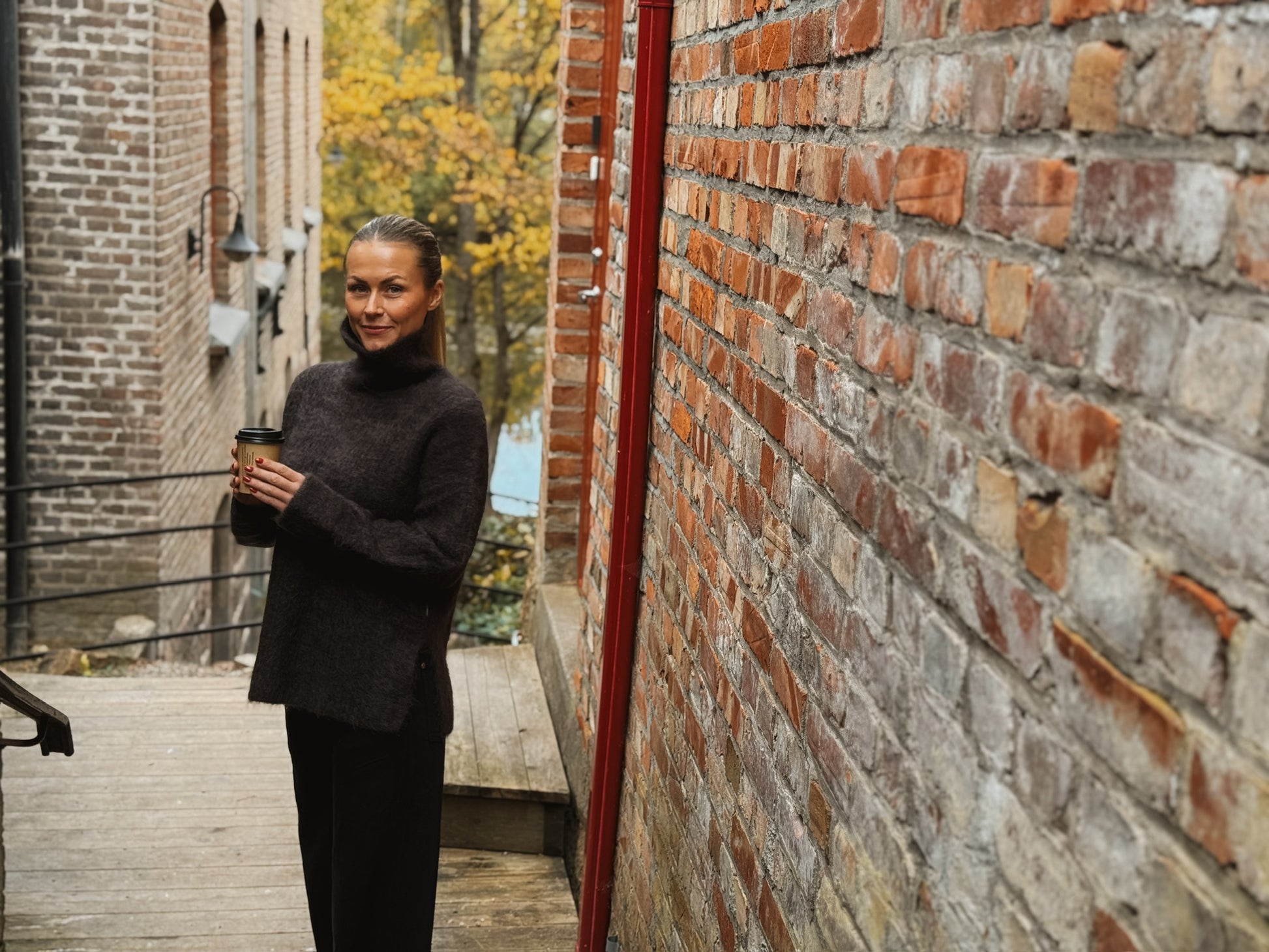 Emilie er en oversized chunky genser med ribbestrikk. Genseren har høy hals, splitter i sidene og lange ermer med oppbrettet mansjett.