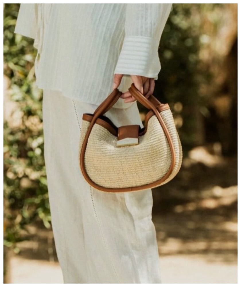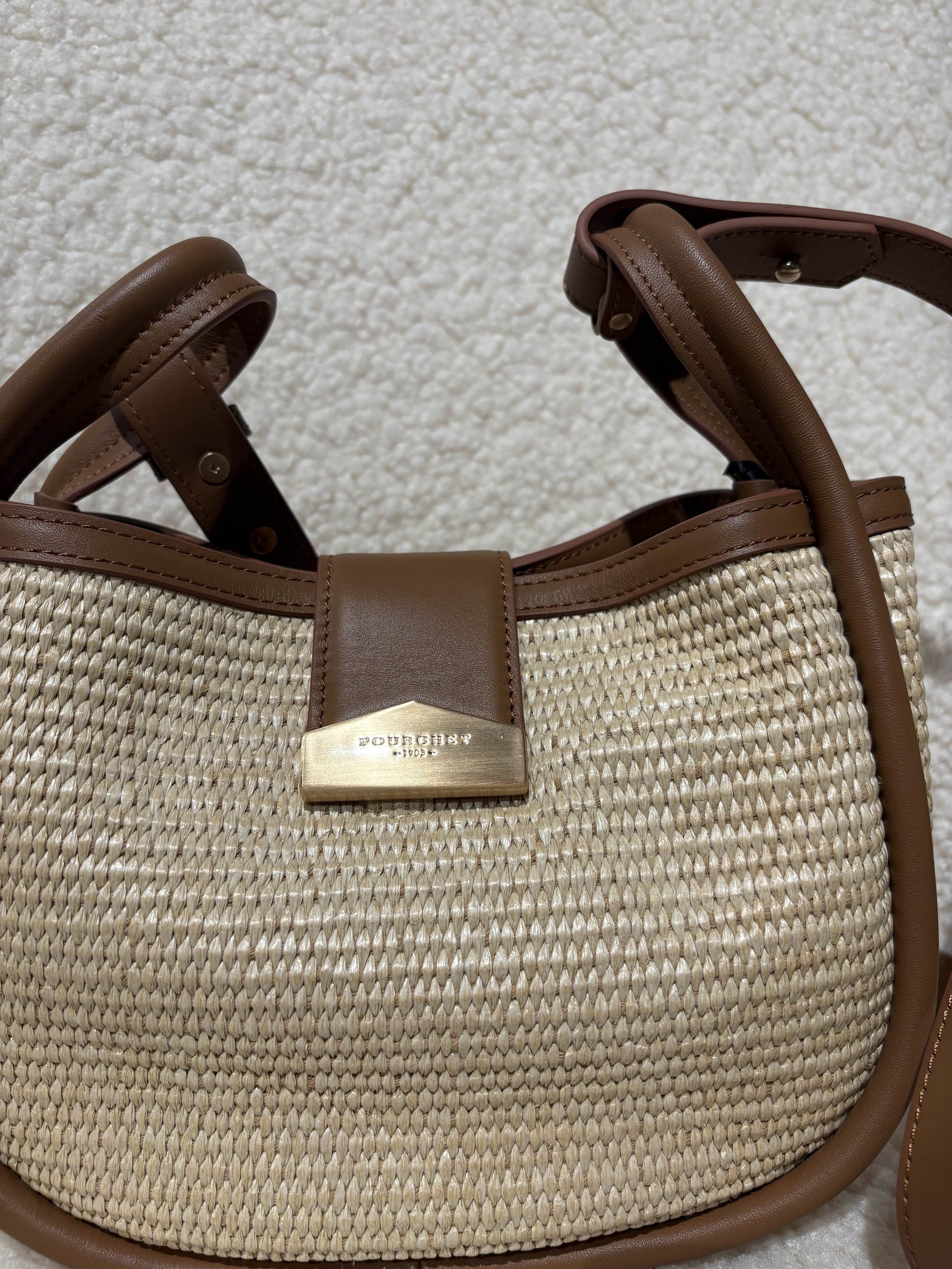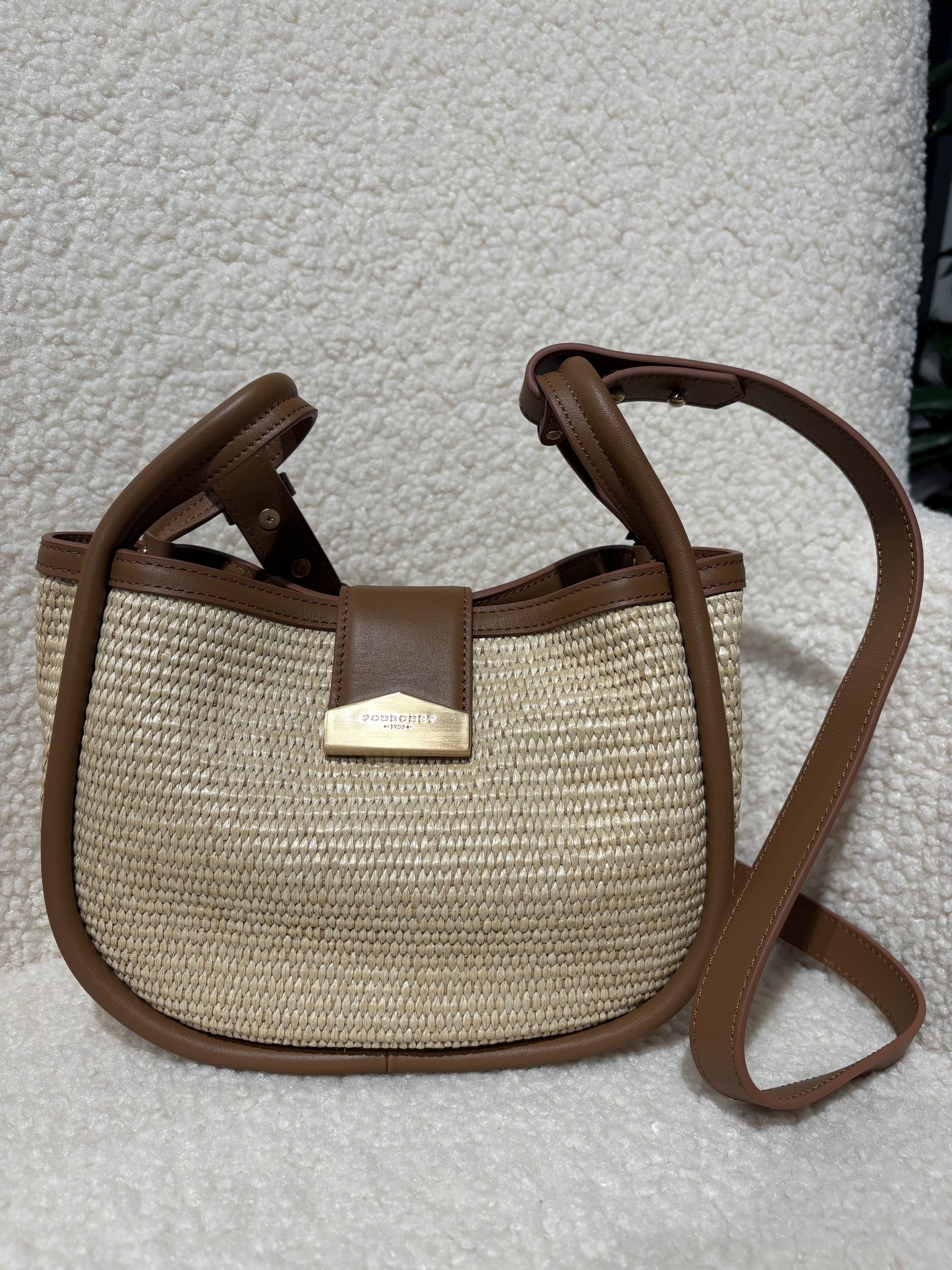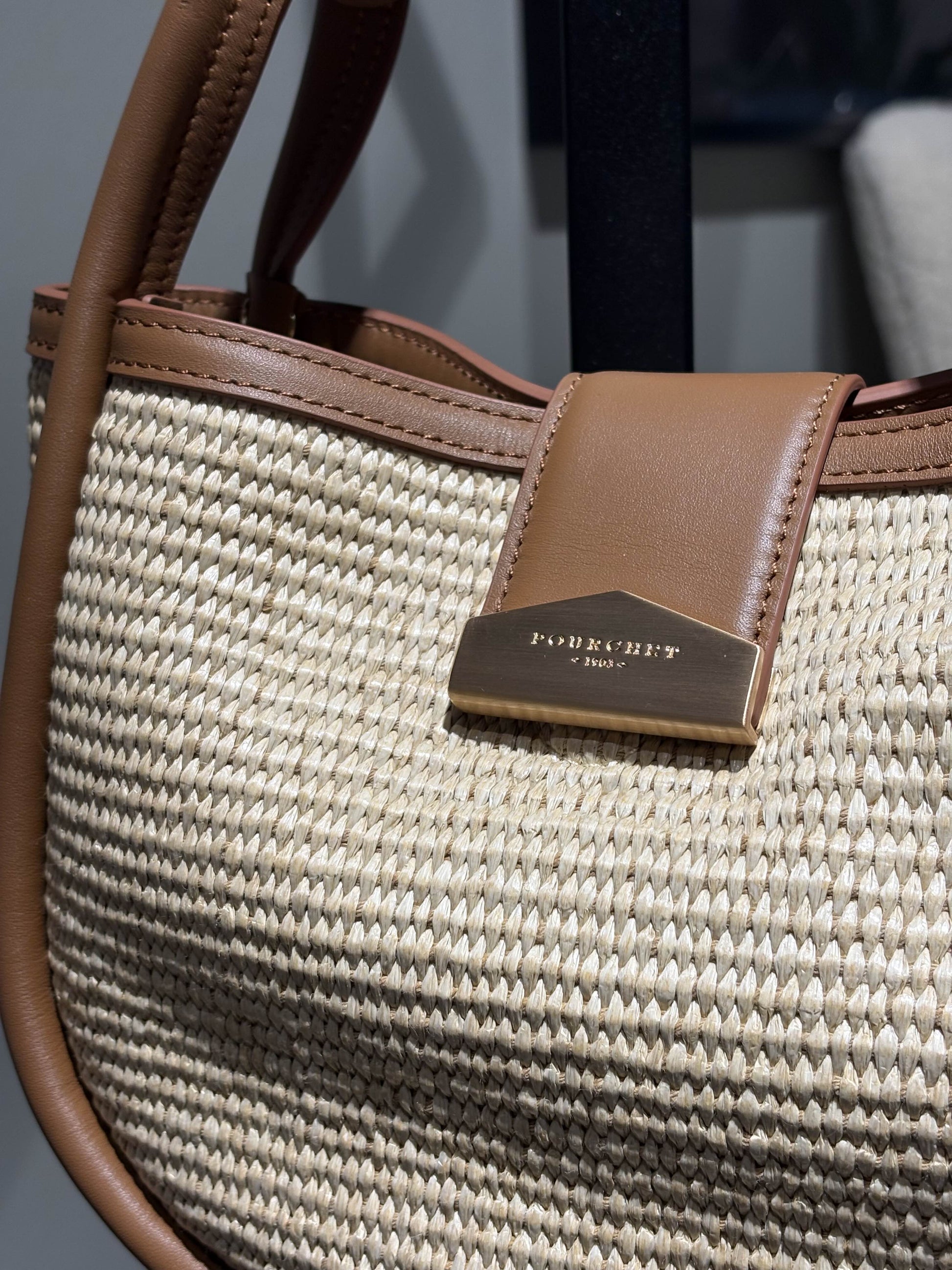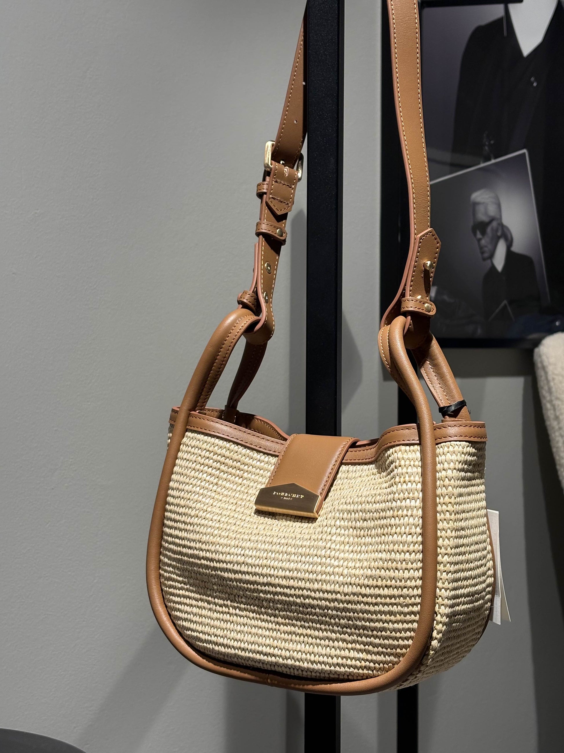 Elegant og sommerlig skulderveske fra Pourchet Paris, designet i en raffinert kombinasjon av flettet naturmateriale og glatte skinndetaljer. Den myke, avrundede formen gir et sofistikert uttrykk, mens både håndtak og justerbar skulderrem gjør vesken fleksibel i bruk.