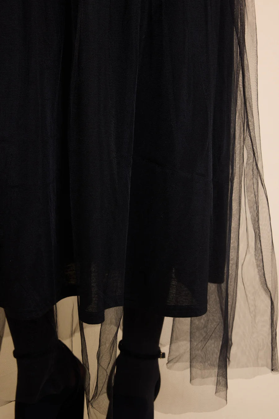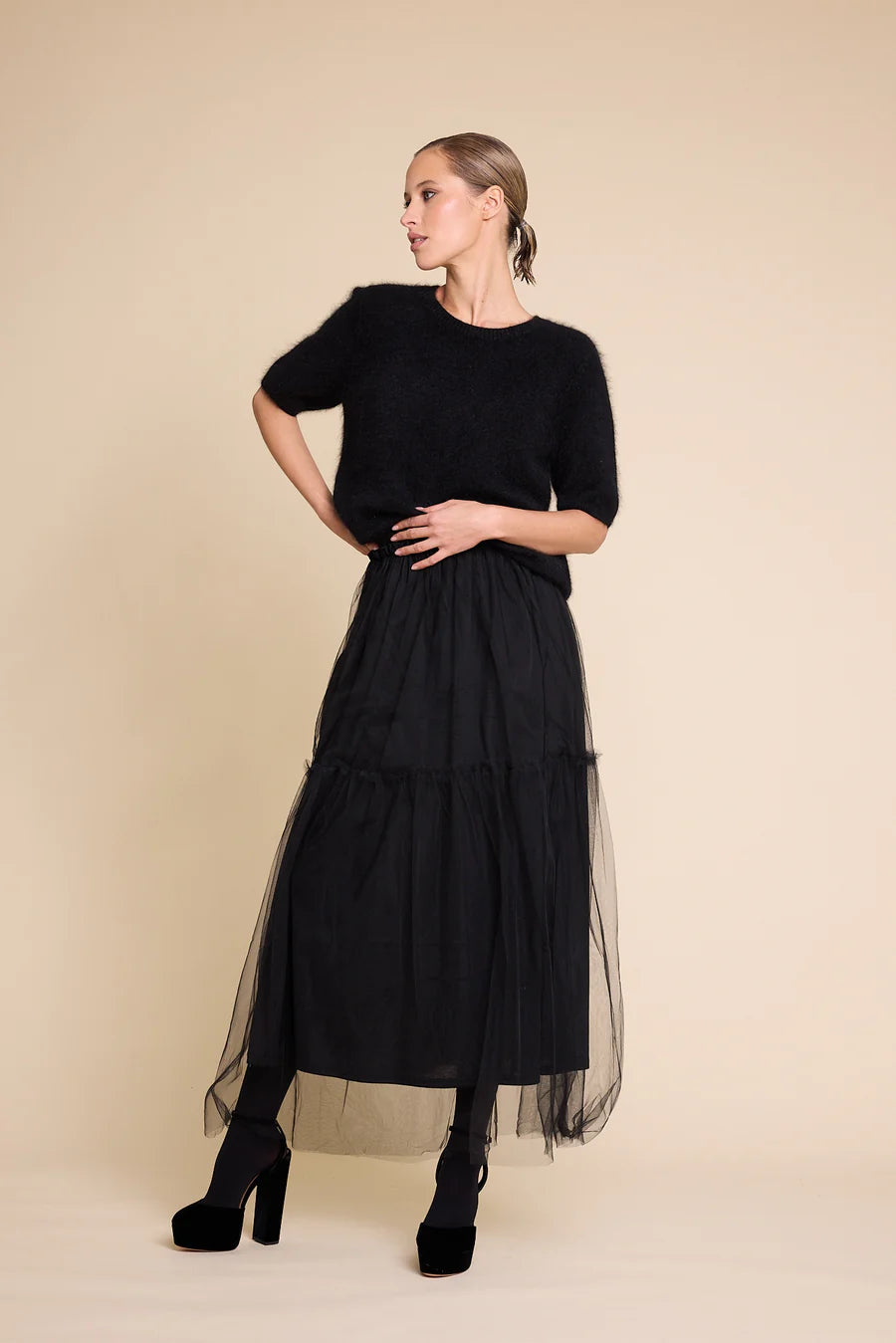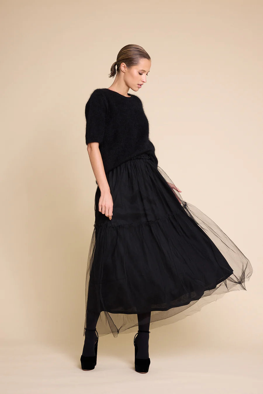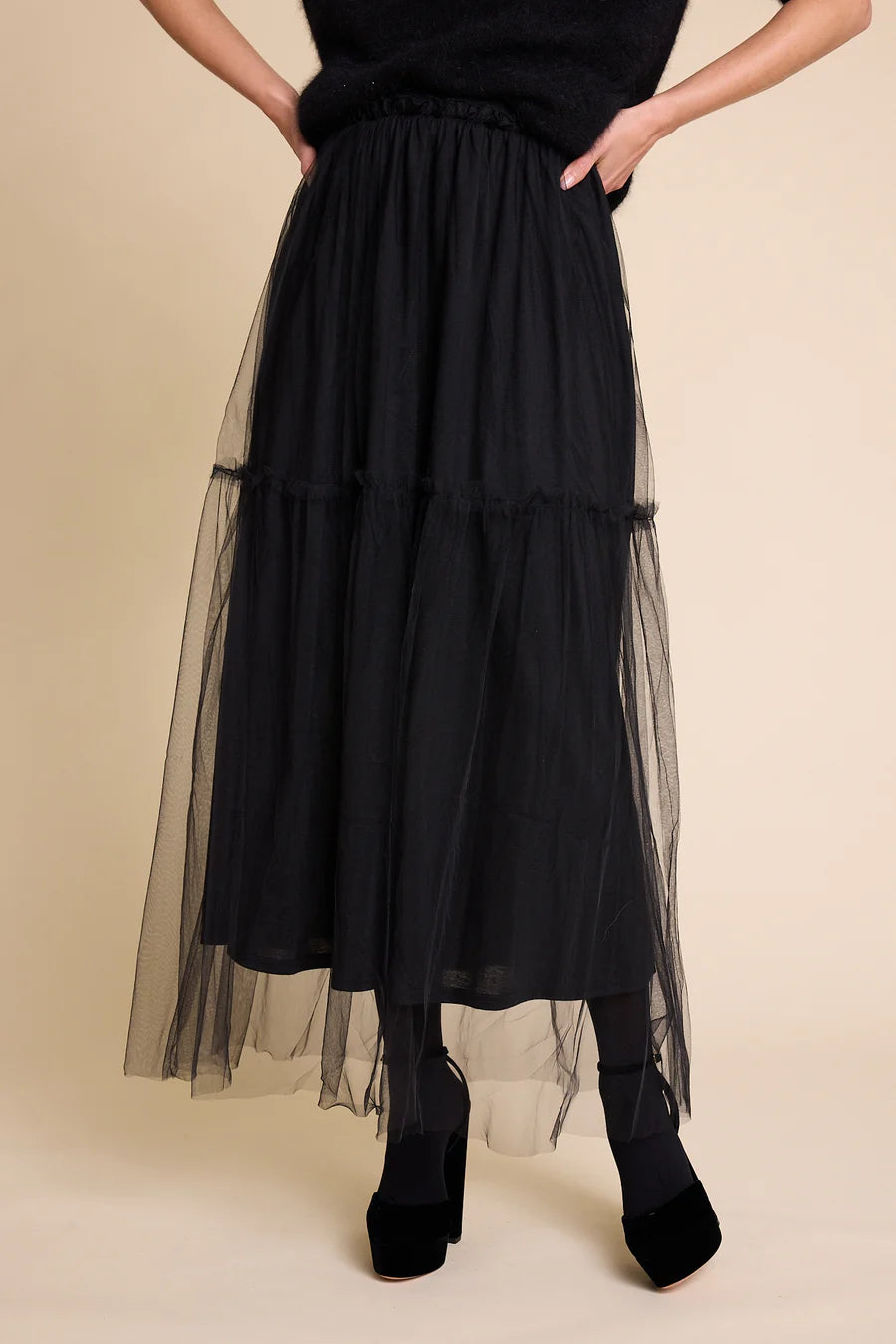 Hay er et vakkert tyll skjørt designet med perfekt A-linjeformet passform og en elastisk linning for komfort hele dagen. Det har et delikat chiffong-overlag som gir et elegant preg, sammen med en rysjert kant og subtil rynkete tekstur for uanstrengt sjarm. Dress det opp med en bluse og hæler, eller hold det avslappet med en koselig genser.