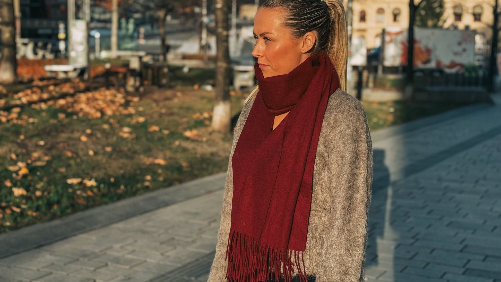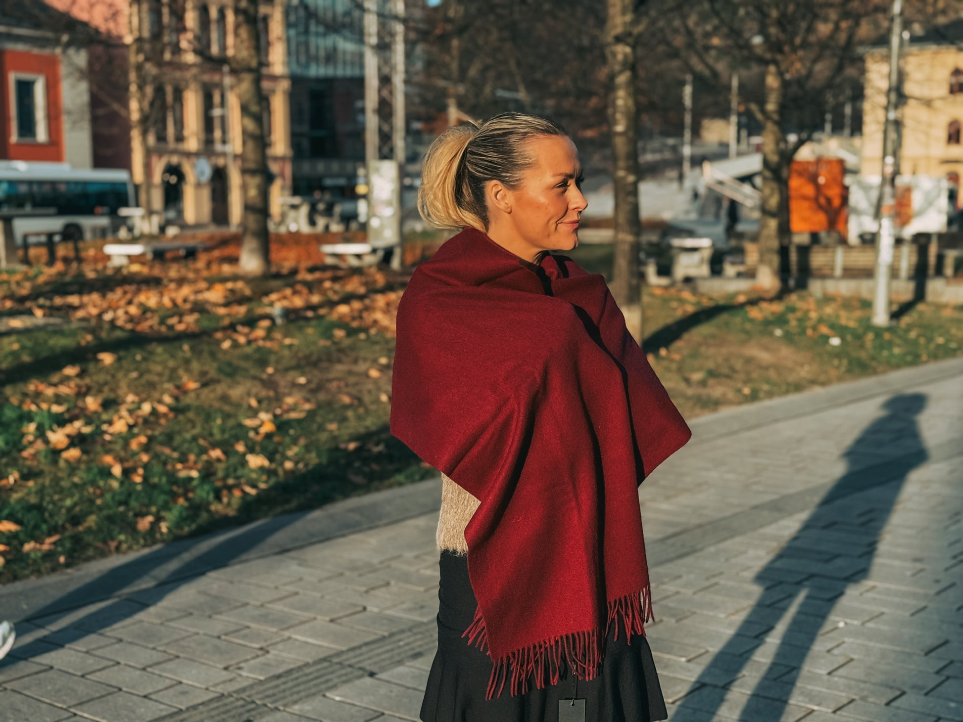 Et rektangulært skjerf i 100% myk lammeull. De fine frynsene langs kortsidene gir det både tekstur og et sofistikert uttrykk. Nohr Lammeullskjerf i burgunder holder deg varm hele sesongen og er et tidløst, stilrent tilbehør som passer til enhver garderobe.