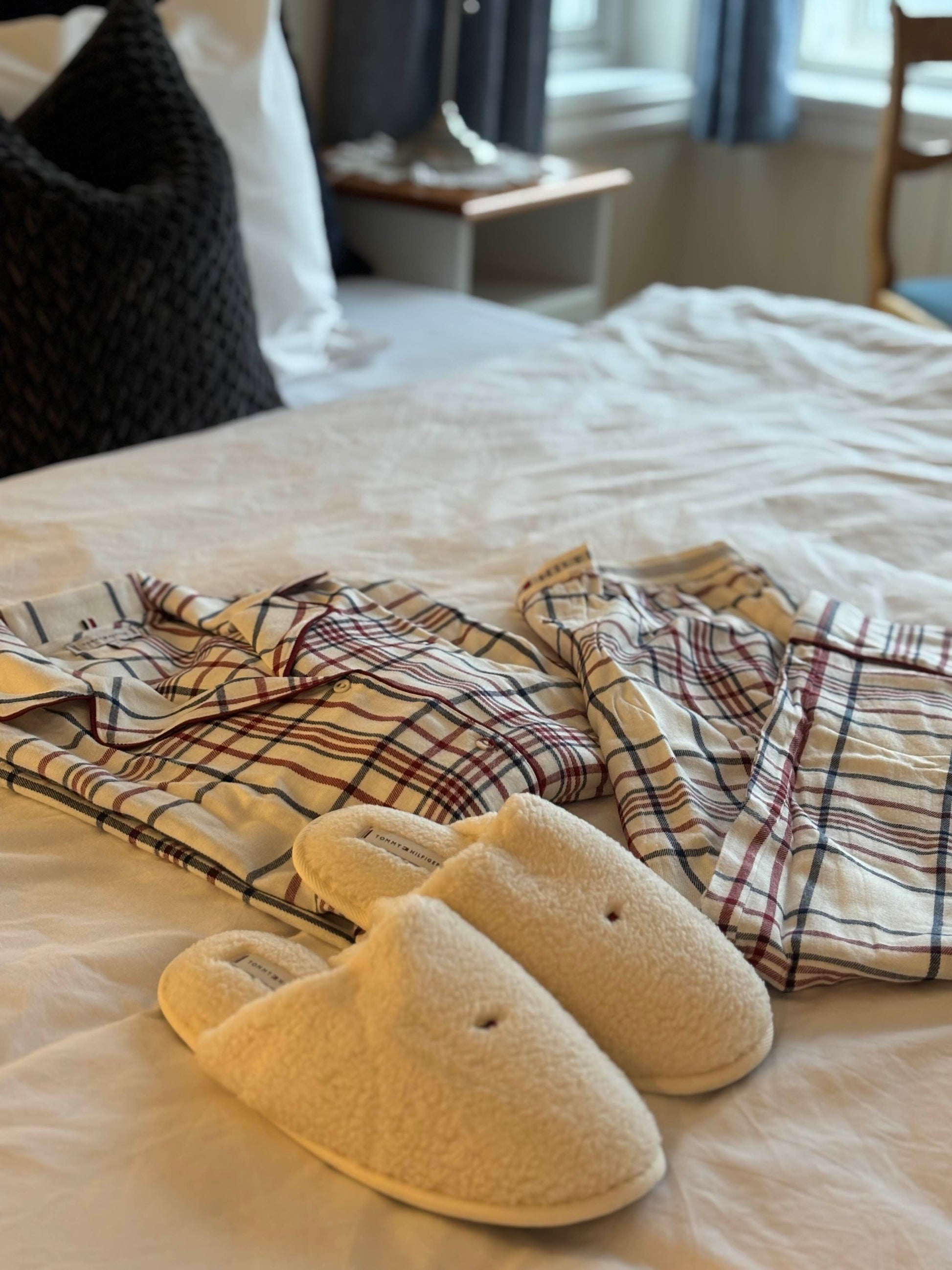 Pysjamasen har klassiske slag, mansjetter og en avrundet avslutning, mens det broderte Tommy Hilfiger-flagget på brystet gir et elegant løft. Den elastiske logo-midjen og de tidløse rutene i City Plaid Ivory Silk gjør settet både behagelig og stilrent. De matchende tøflene setter prikken over i-en og gjør antrekket perfekt for rolige morgener og avslappede kvelder hjemme.