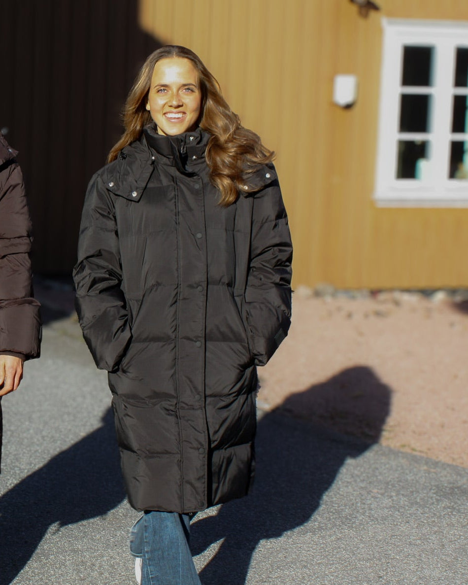 Deilig boblejakke til høst og vinter. Åpnes og lukkes med glidelås og knapper hele veien. Hetta kan tas av og på med knapper og justeres med stropper. Lommer på begge sider. Jakken er vannavstøtende.