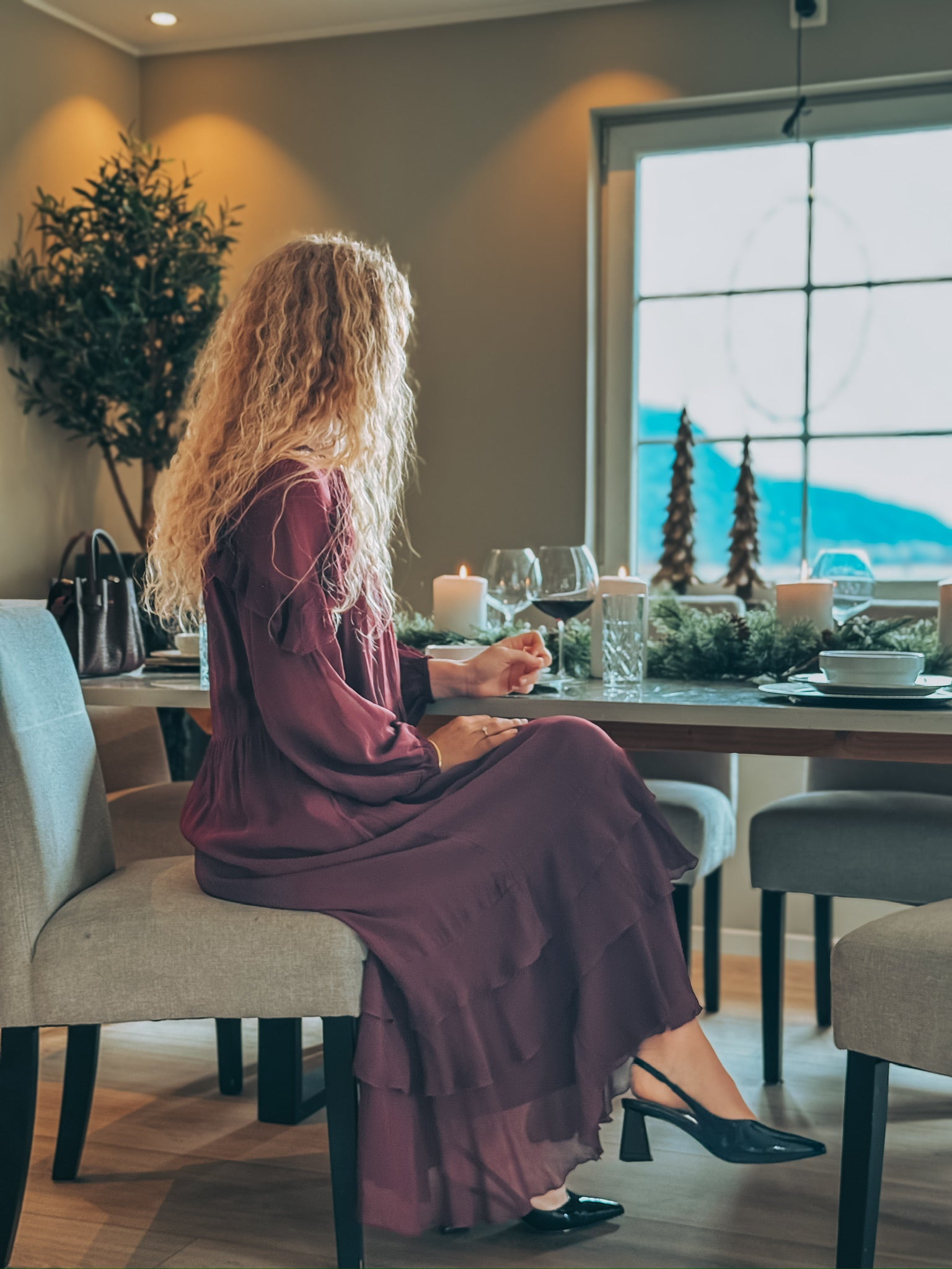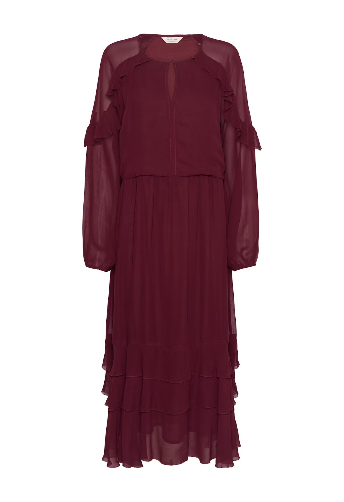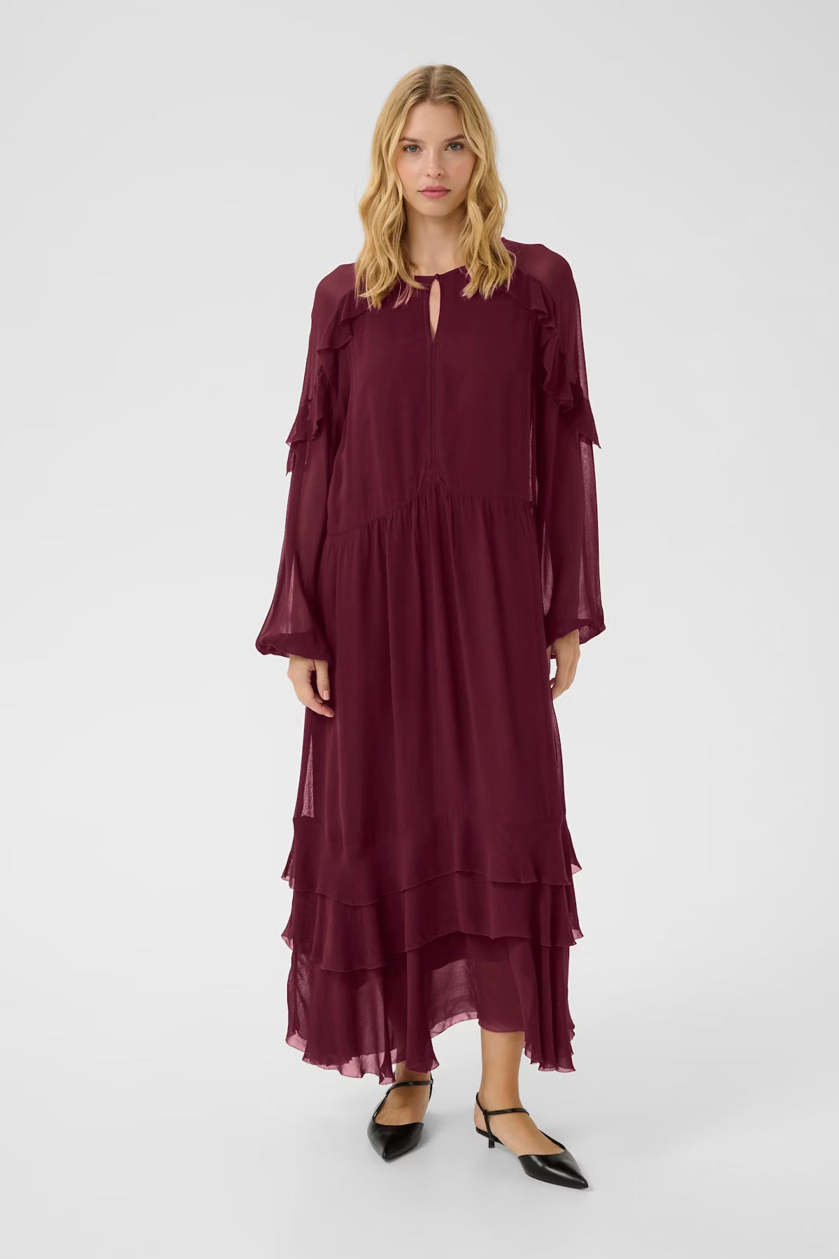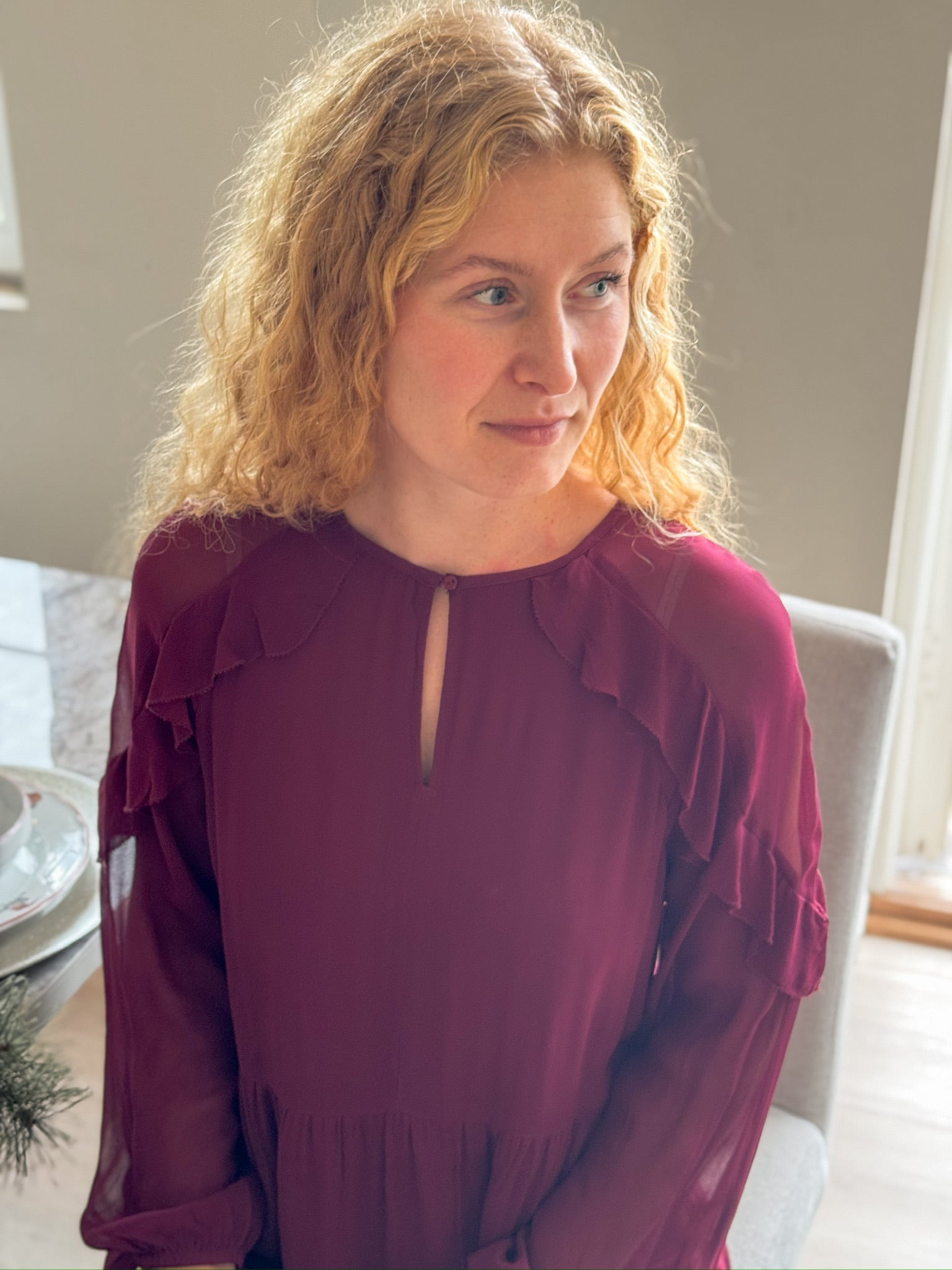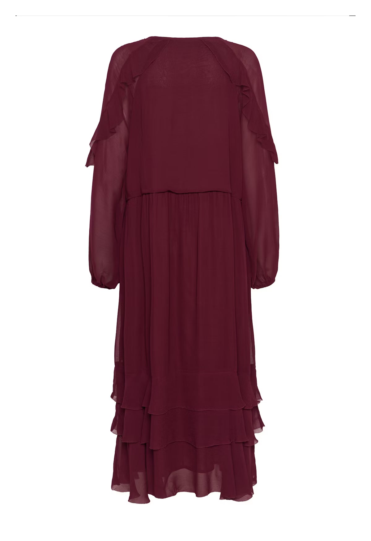 Denne lange kjolen i burgunder chiffon har et elegant fall med lagvise volanger nederst og diskrete detaljer ved skuldrene. Det lette materialet og de transparente ermene gir et luftig uttrykk – perfekt for spesielle anledninger og stemningsfulle kvelder. Style med enkle sko for en balansert look.