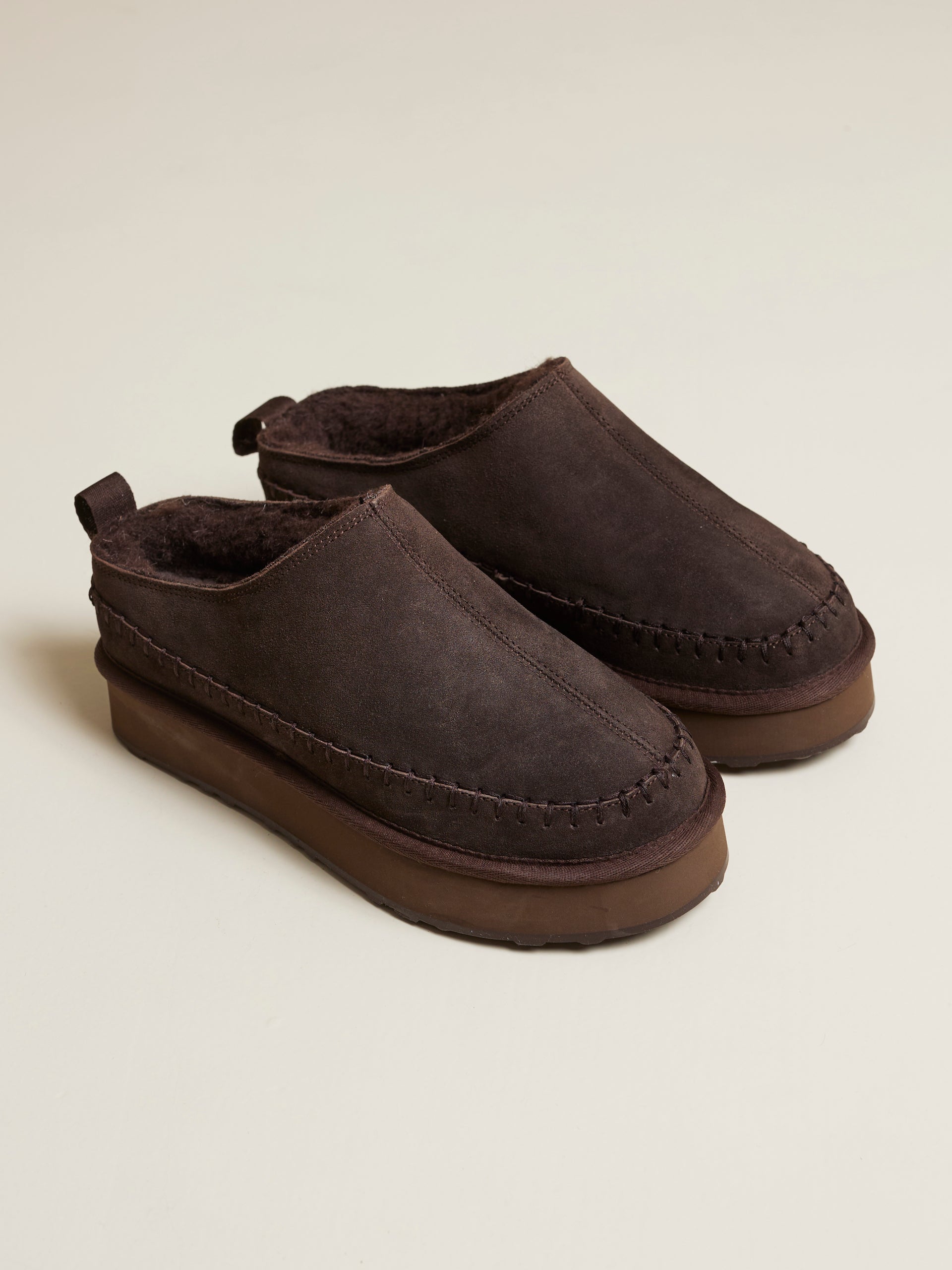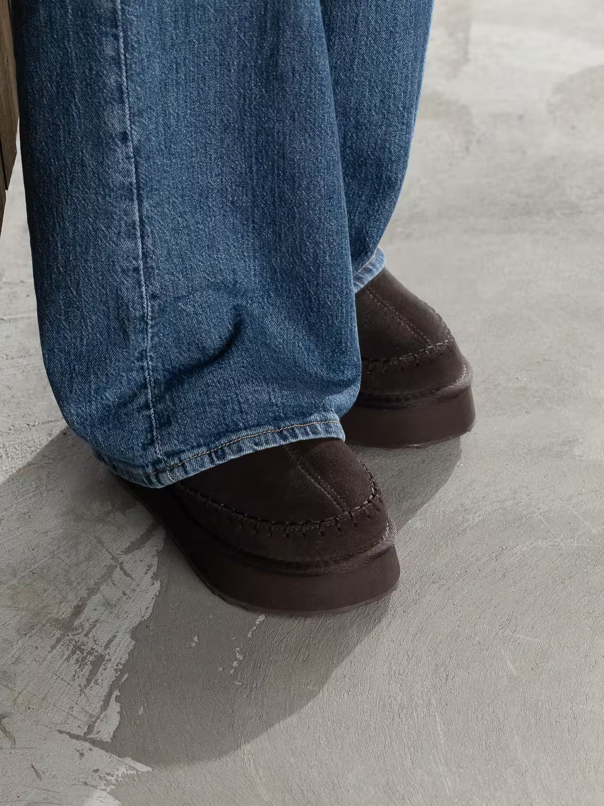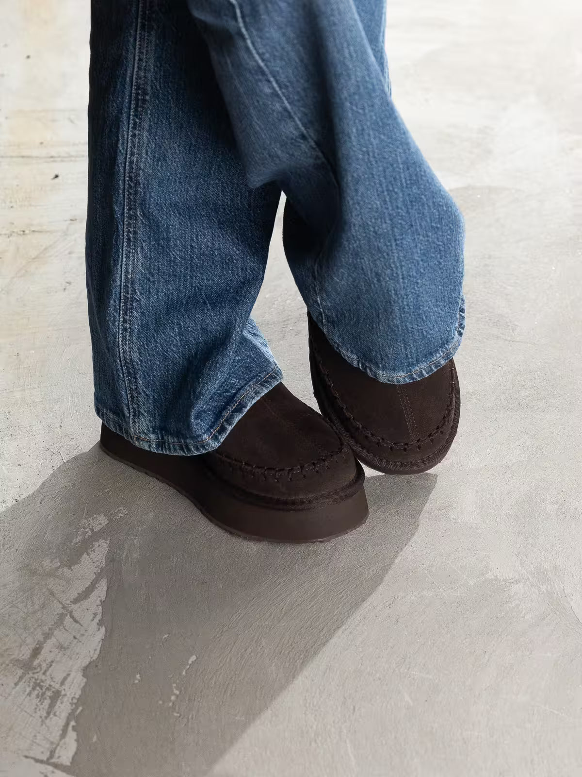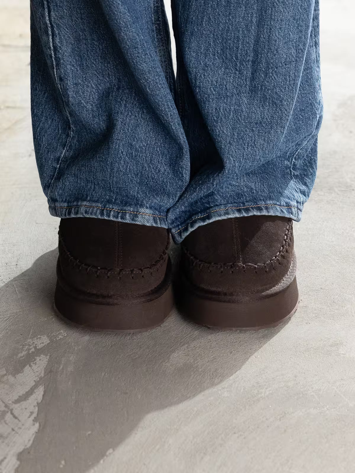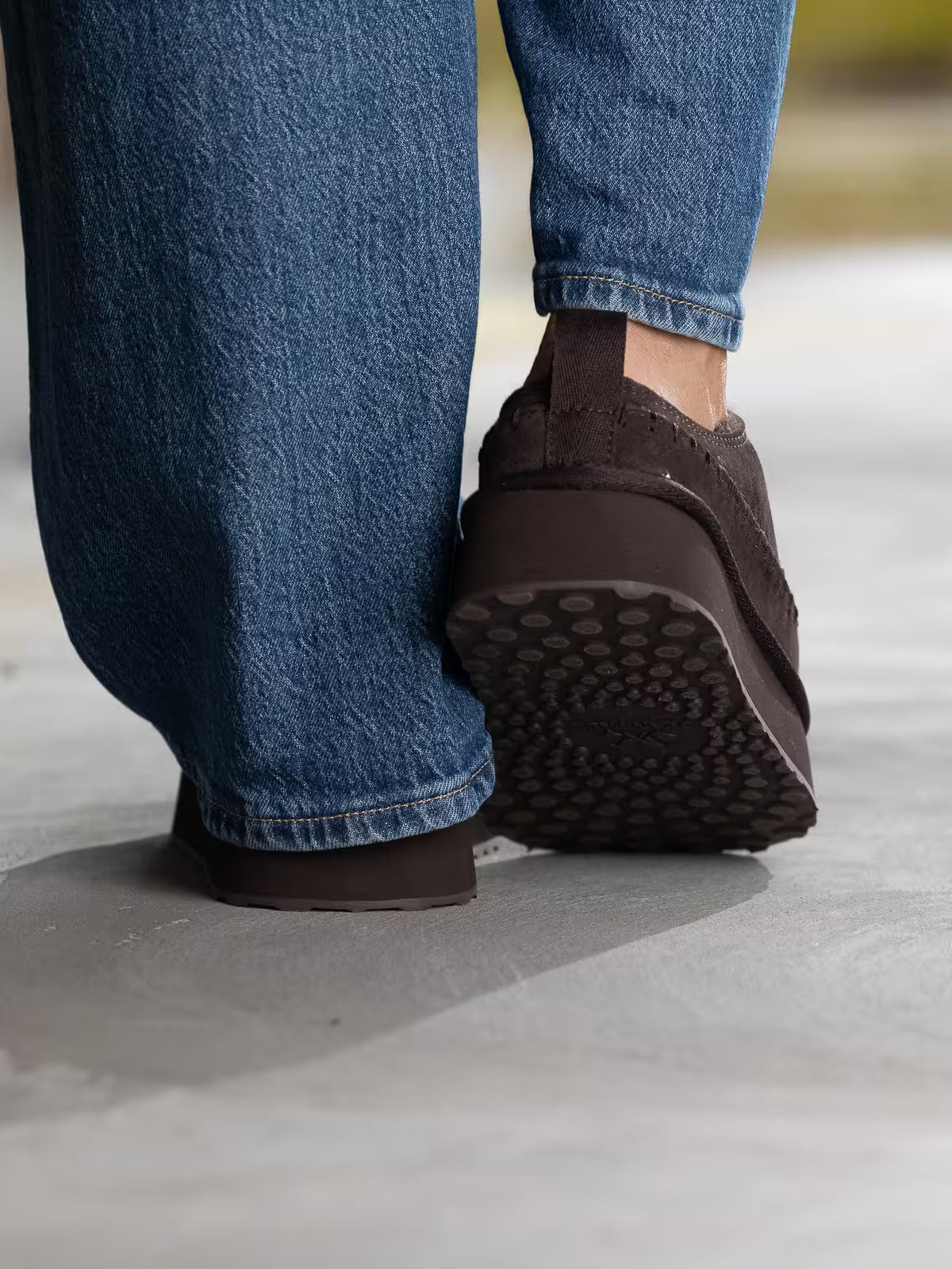 Korte sheepskin-boots i semsket, vannavstøtende skinn som holder føttene varme uten å bli tunge. Den tidløse fasongen gjør dem like anvendelige på kjølige høstdager som gjennom vinteren – et funksjonelt valg med et rent, elegant uttrykk.