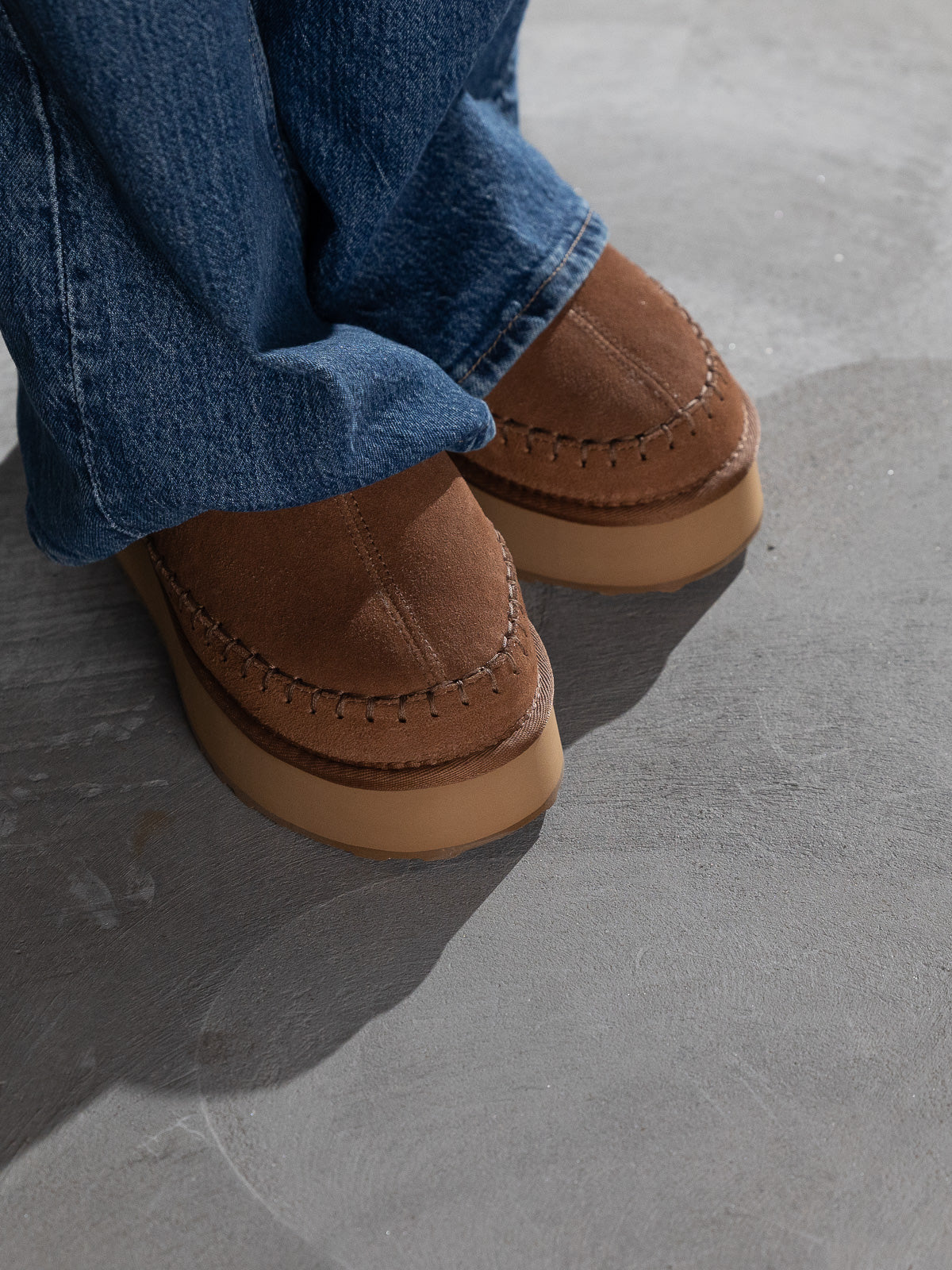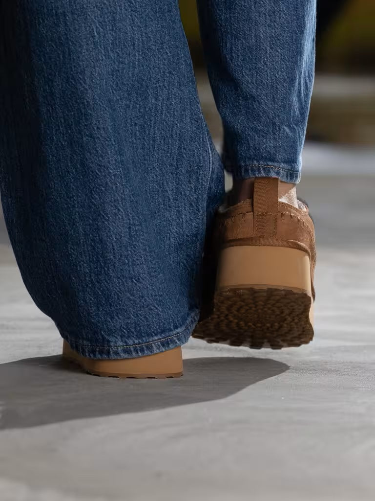 Korte sheepskin-boots i semsket, vannavstøtende skinn som holder føttene varme uten å bli tunge. Den tidløse fasongen gjør dem like anvendelige på kjølige høstdager som gjennom vinteren – et funksjonelt valg med et rent, elegant uttrykk.