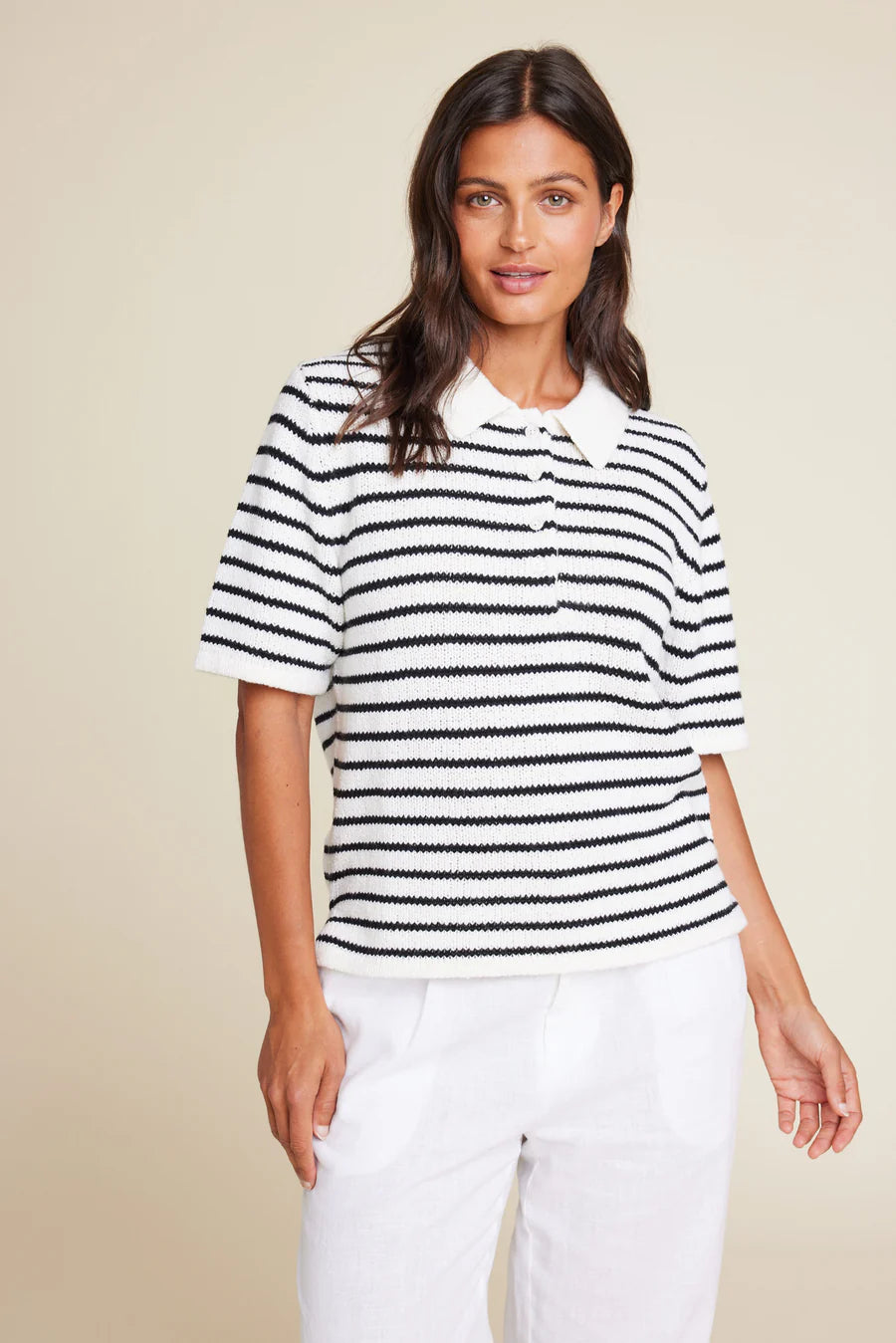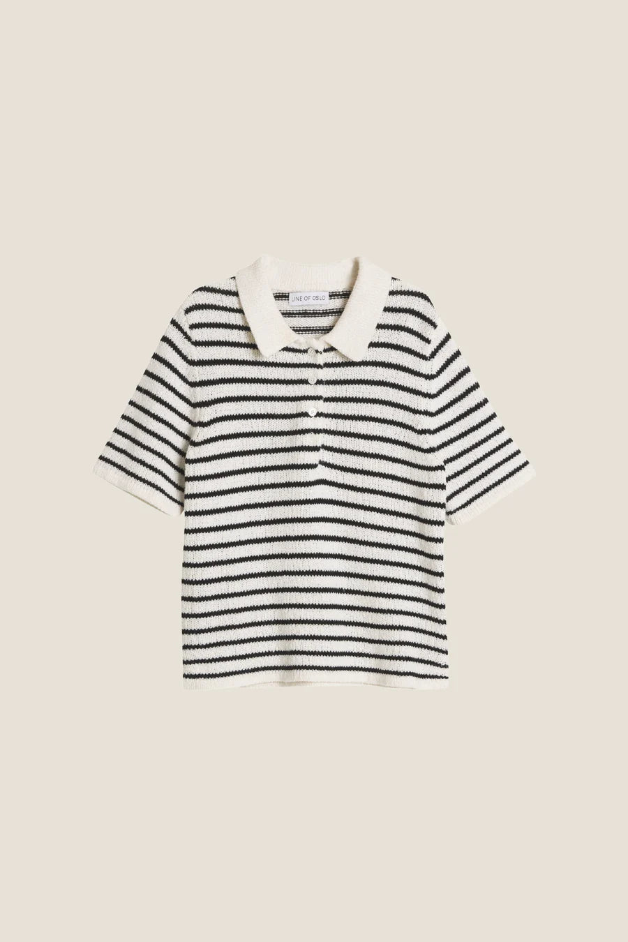 Vår strikkede polo-T-skjorte er laget av en myk blanding av merinoull og bomull. Den har et stripete design, en statement-krage og V-hals med knapper. Designet med sidesplitter for en avslappet passform. Style den med våre Moon 25 linbukser for den ultimate sommerlooken.